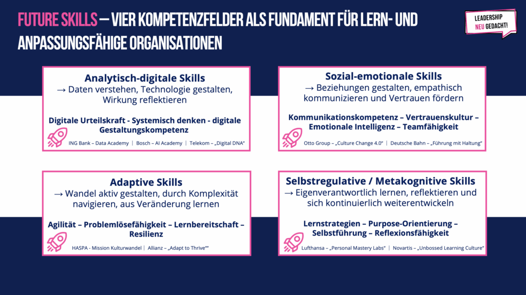 - Sozial-emotionale Skills – empathisch führen, Vertrauen schaffen, Beziehungen gestalten.